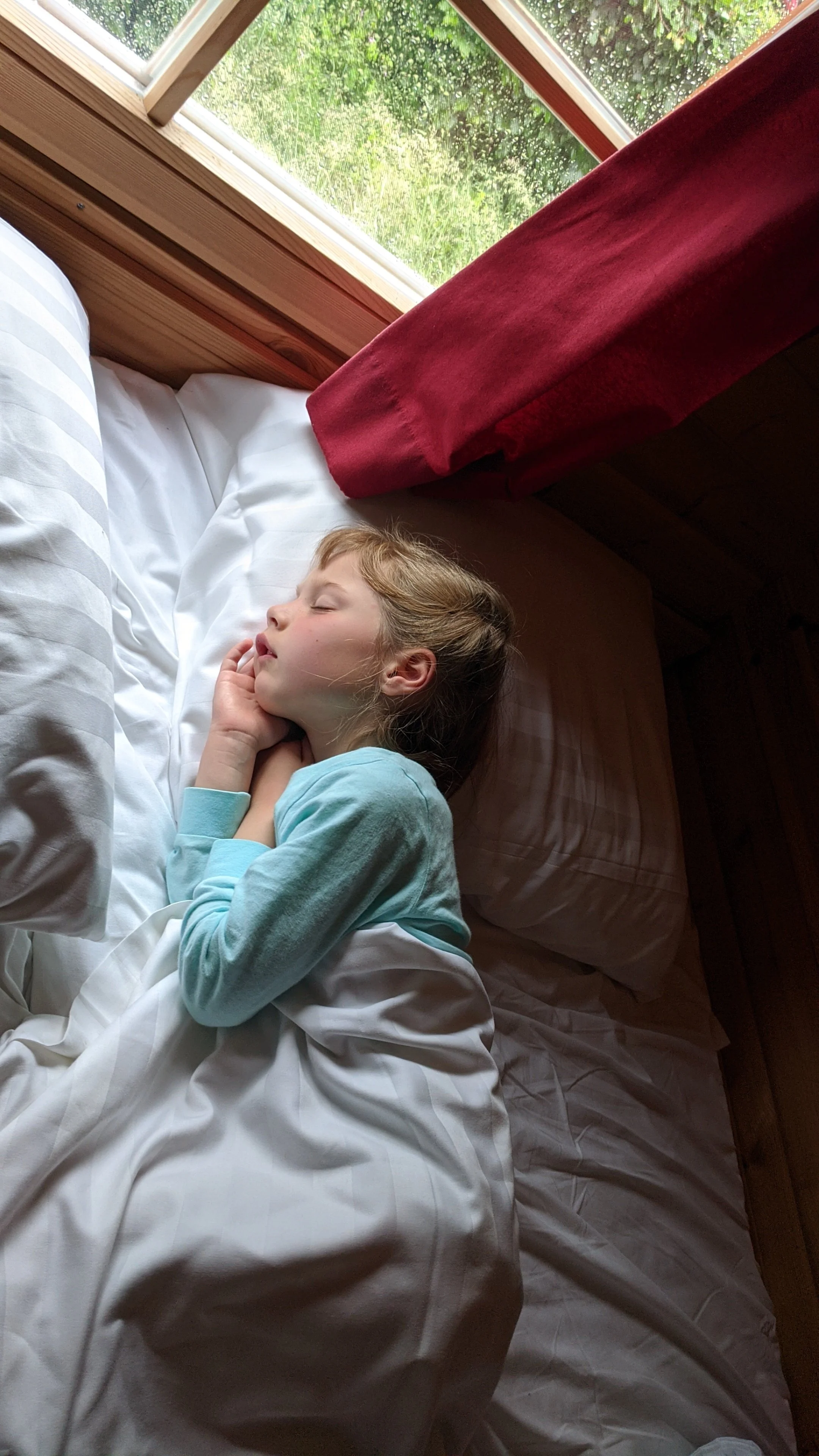 As a reference, I used a photo of my daughter when she was six years old and suddenly came down with a fever during a weekend trip. Since the weather was beautiful, we had fun outdoor activities in mind for the weekend but ended up holed up in the cabin instead.