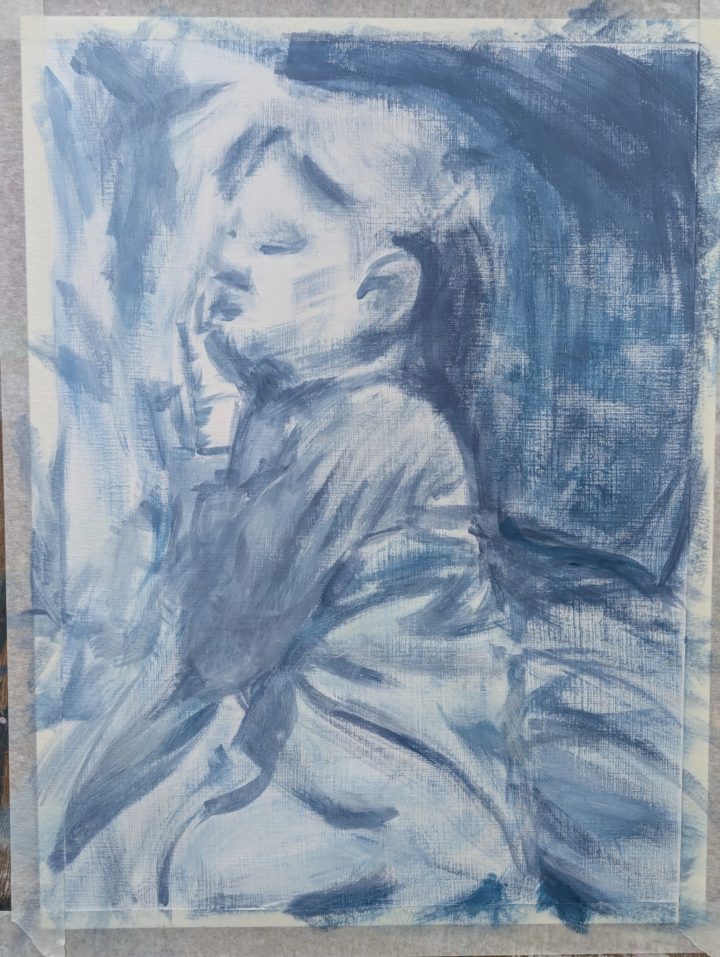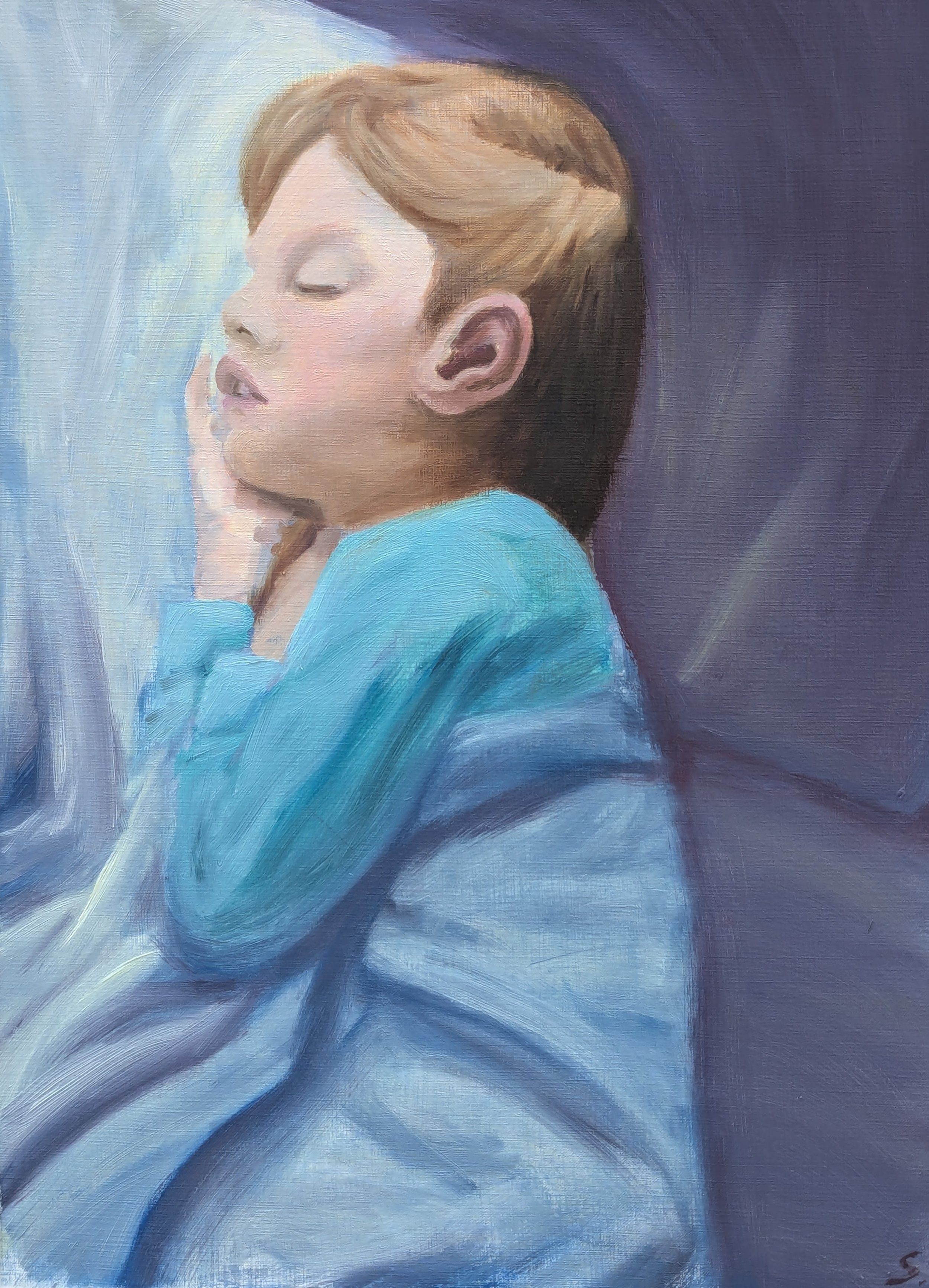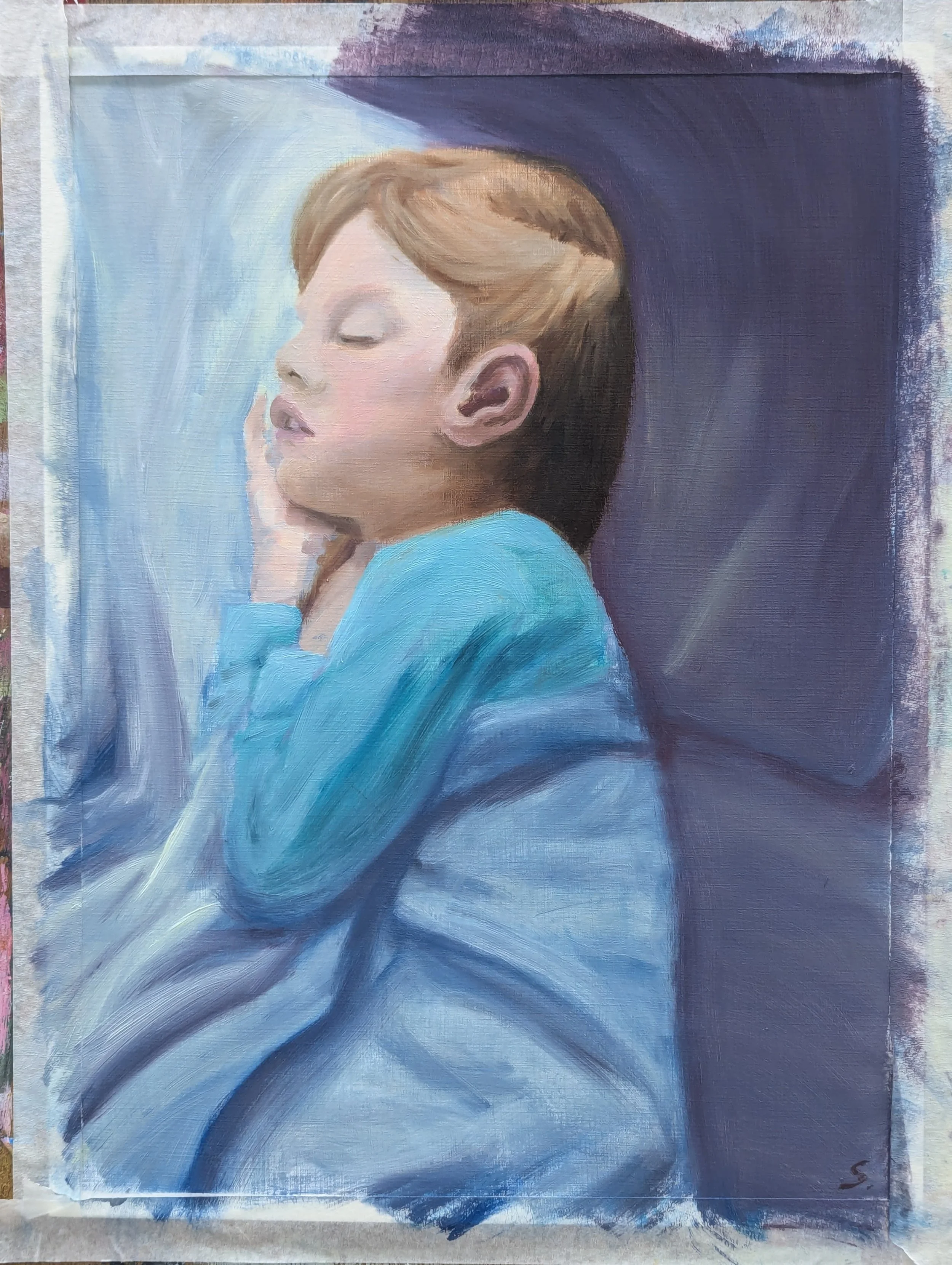 I started the painting as a loose sketch in acrylic. Initially, I planned to paint my daughter in oil with a lot of detail while leaving the bedding untouched as a sketch. When I finished the sketch, my classmates and teacher told me that I could leave it all untouched. It looked finished, already capturing the scene.