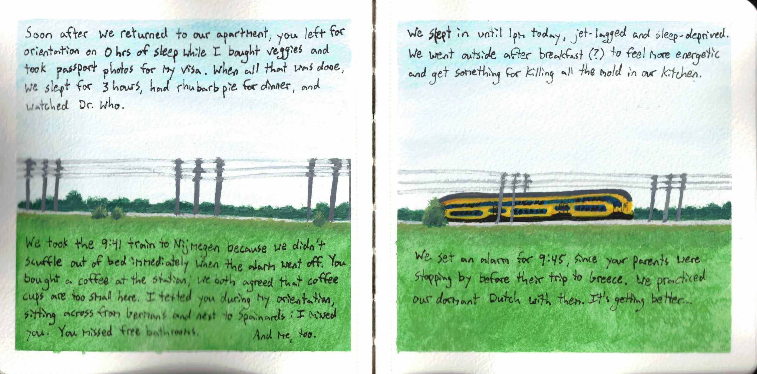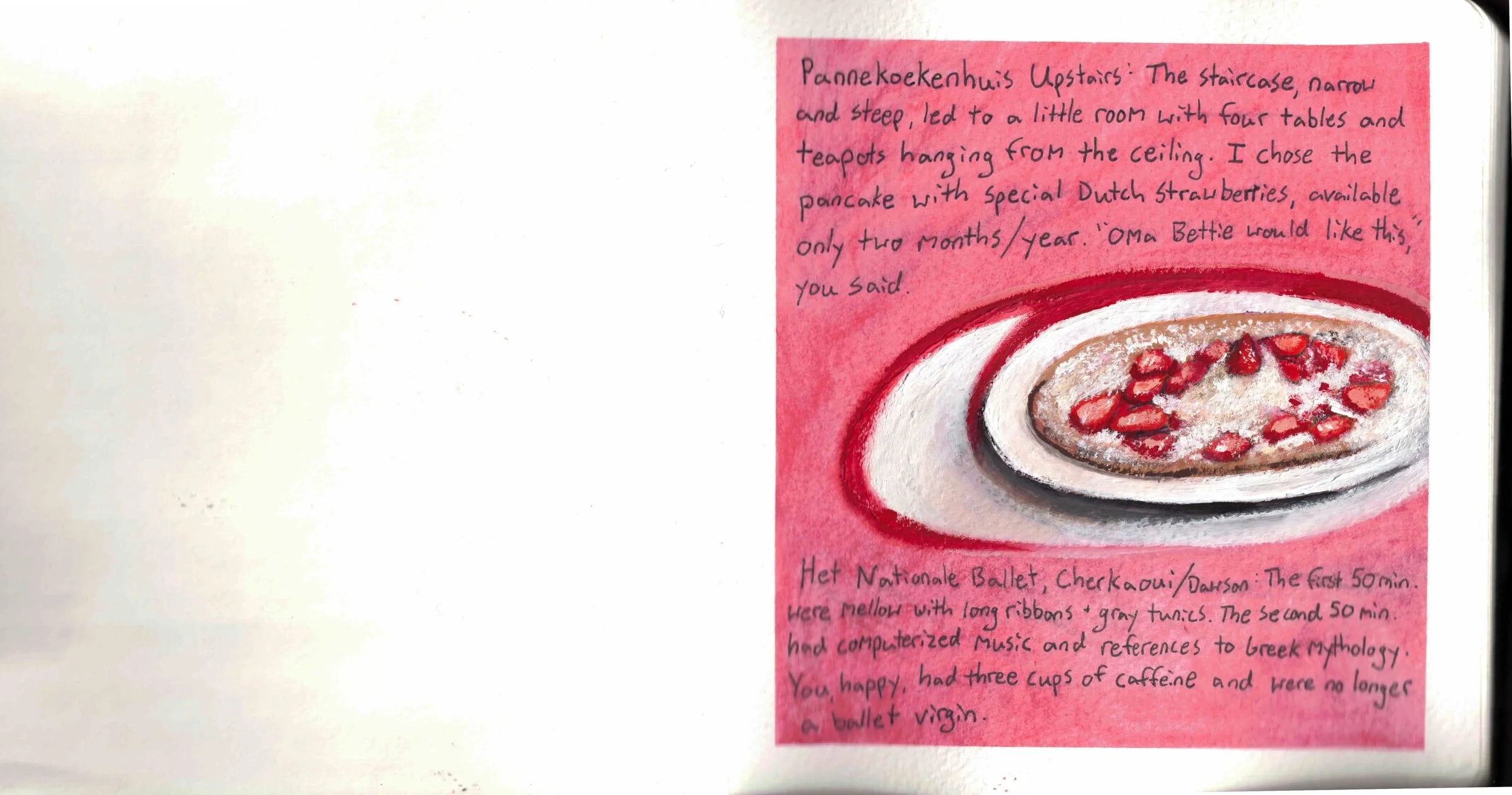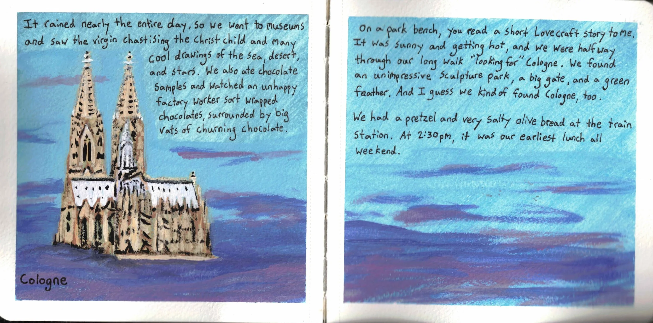 I first realized this on pages 4-5 when I painted the cathedral in Cologne to match the text. I didn't feel like painting the surrounding city, so I painted clouds around the cathedral as if it were floating in the sky. That added whimsy to the text, but the image could stand on its own, too.