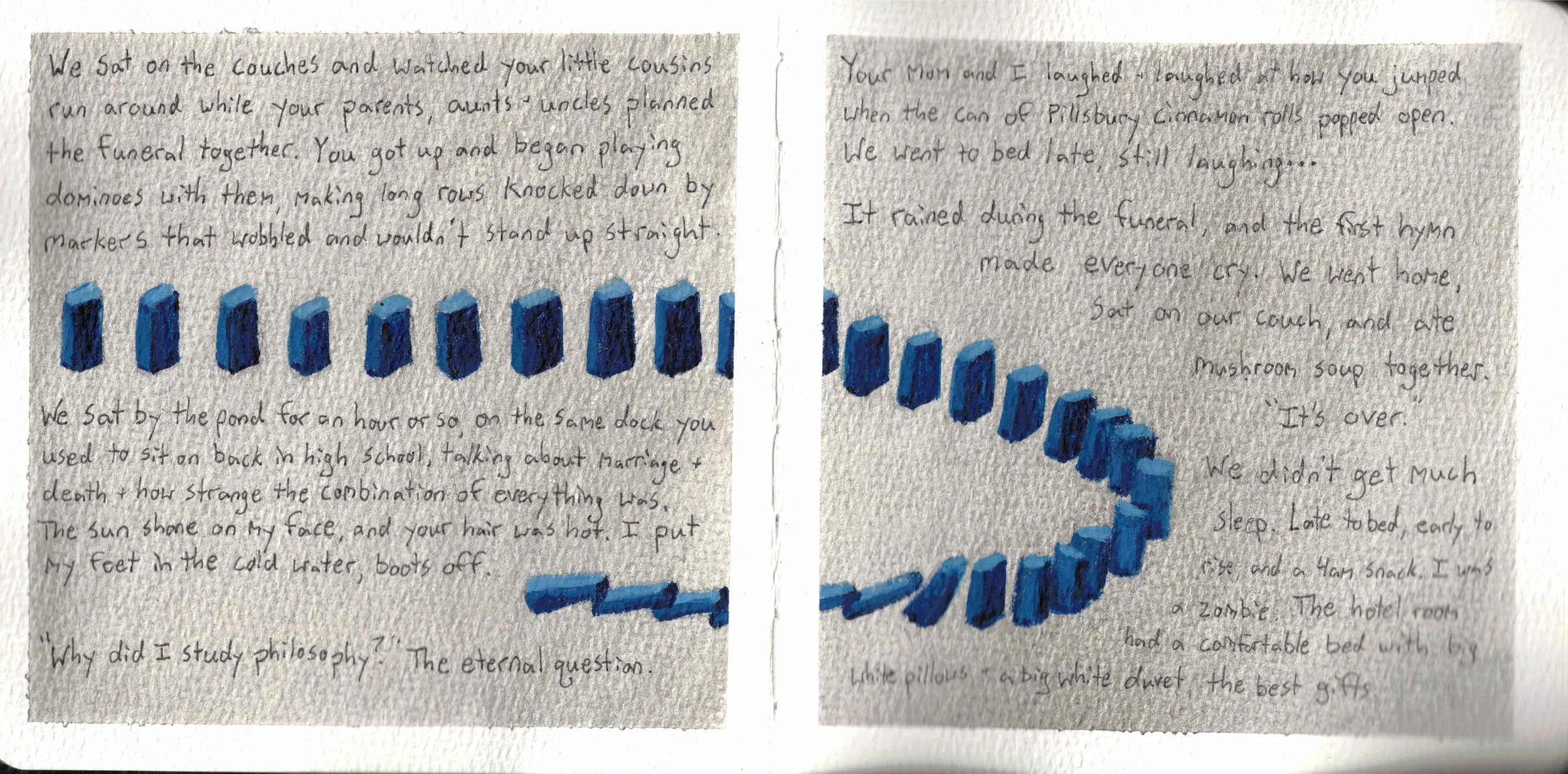 Typically I just transcribed words directly into this book without much artistry, but a few times, I thought about the visual impact of the text, too. For example, the lines on page 23 are separated like a poem, and on pages 42-43, the paragraphs have a downward slant leading to the phone.