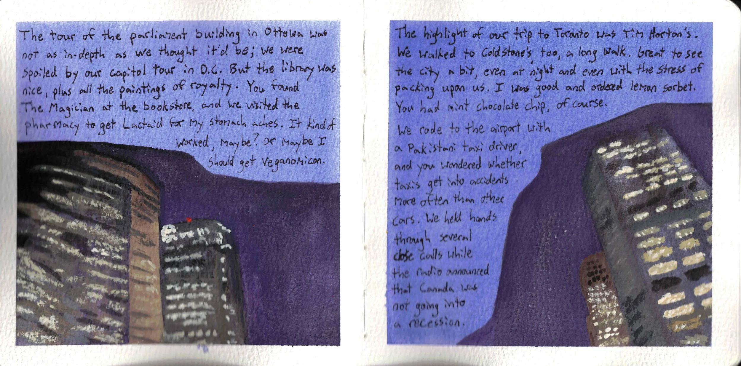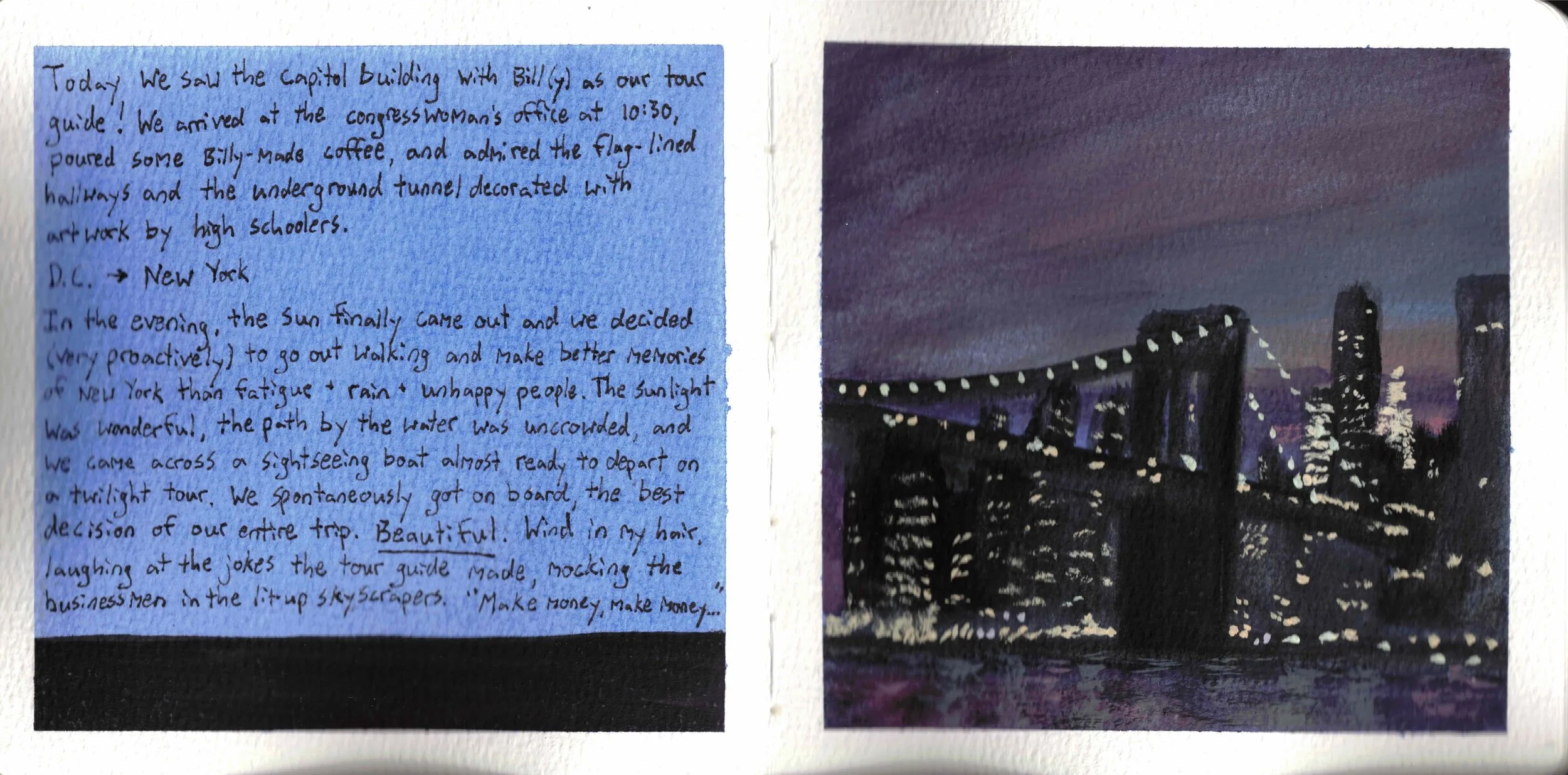 This became clear on page 35, when I used a full page for an image of New York. I'd done a full-page image before (page 25), but I'd added words which detracted from the image. When the image is free of words, it stands out from the rest of the journal, making that scene or experience appear more special.