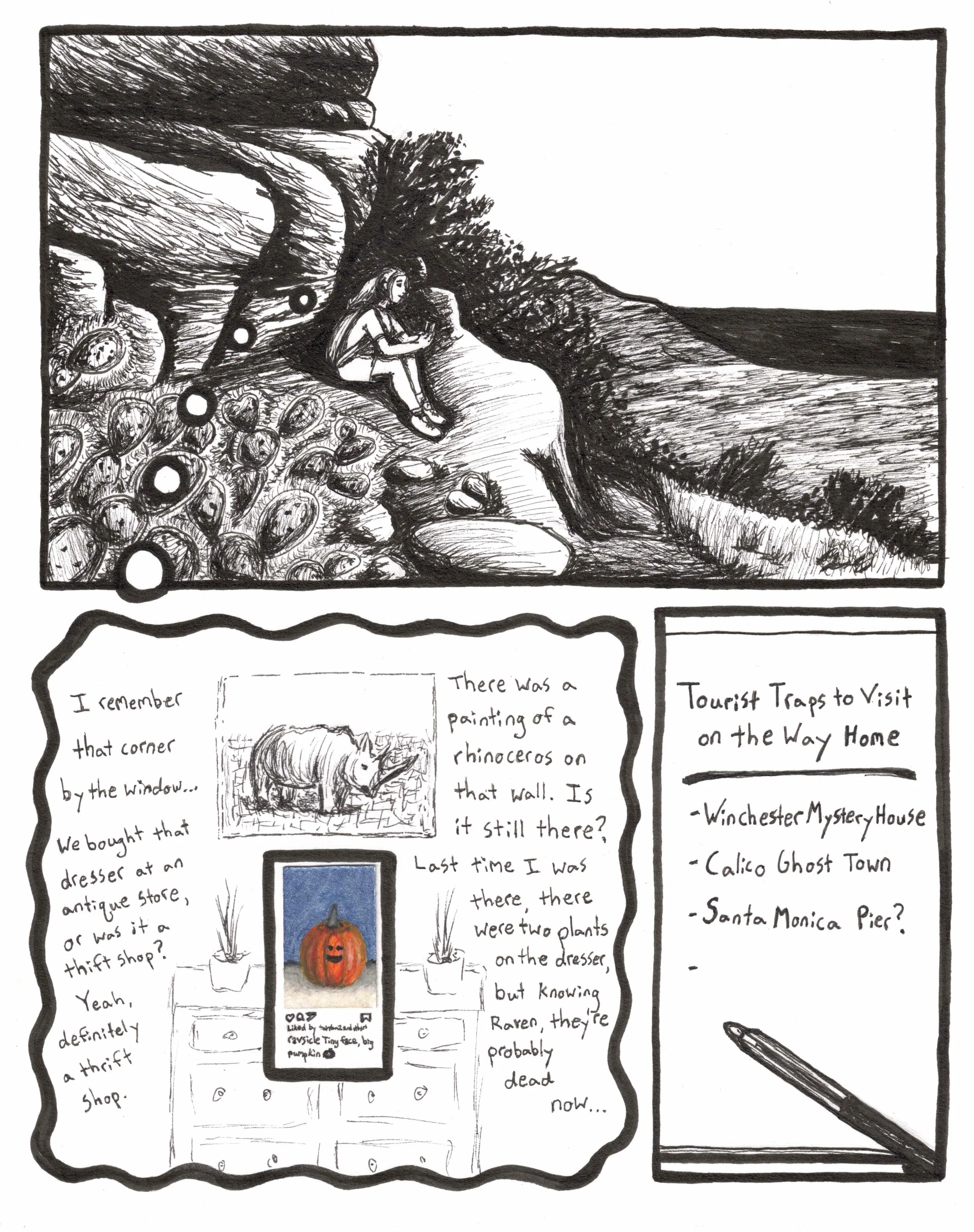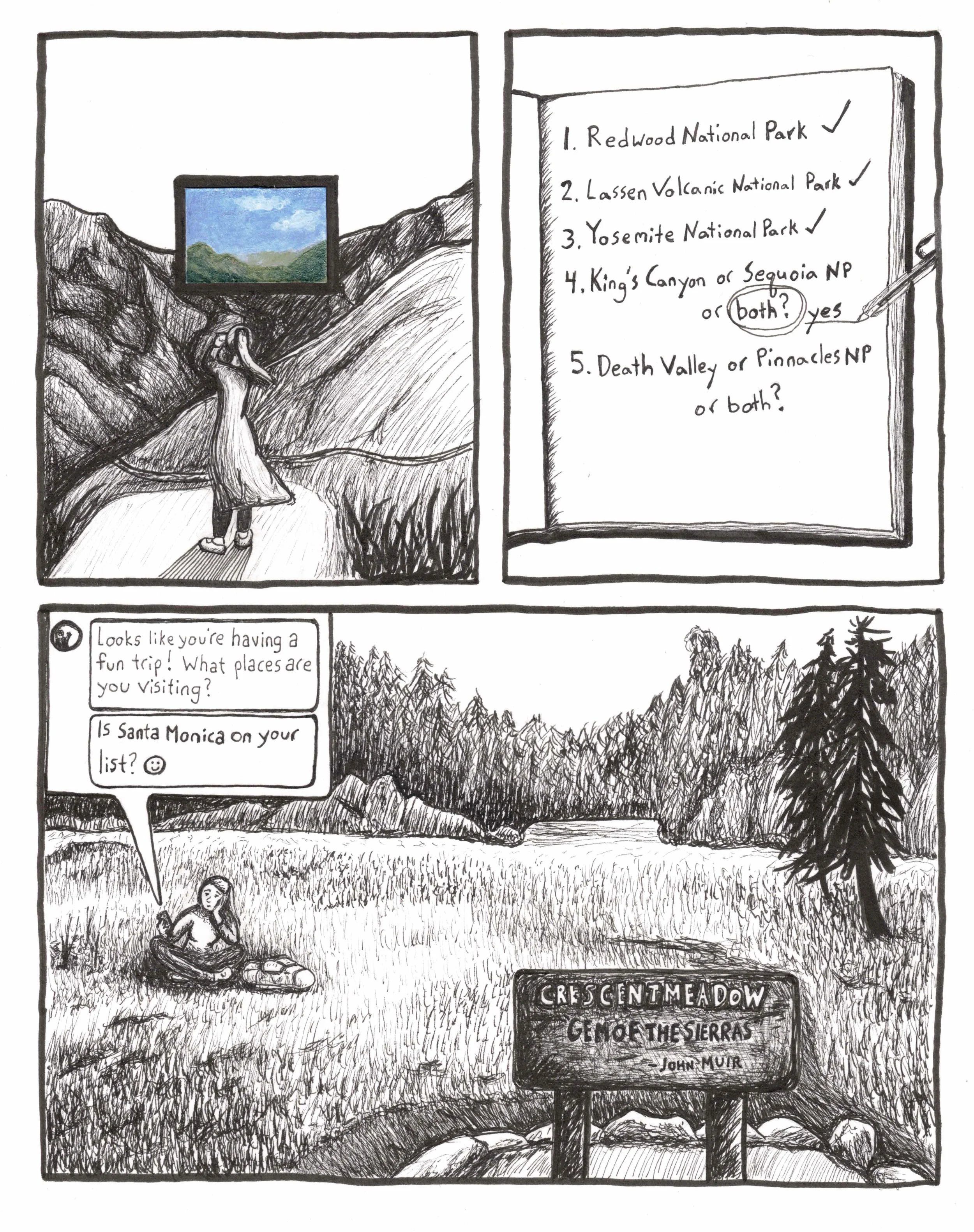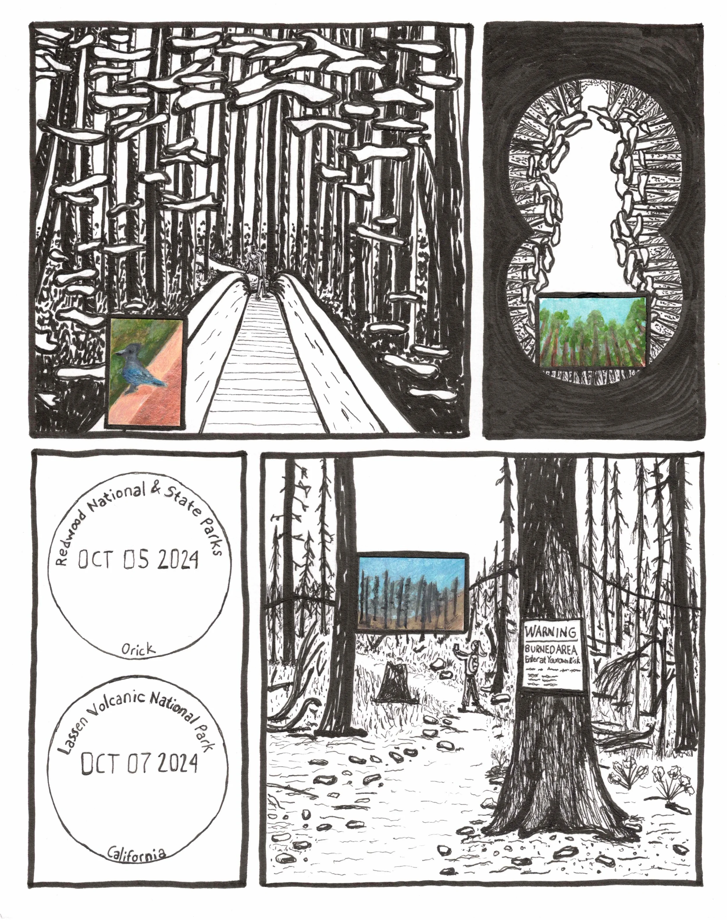I created this comic for Inktober 2024, combining tiny acrylic paintings with ink art. Each frame was inspired by a prompt, and since the prompts revolved around adventure, it ended up being a travelogue set in California with a romantic subplot.