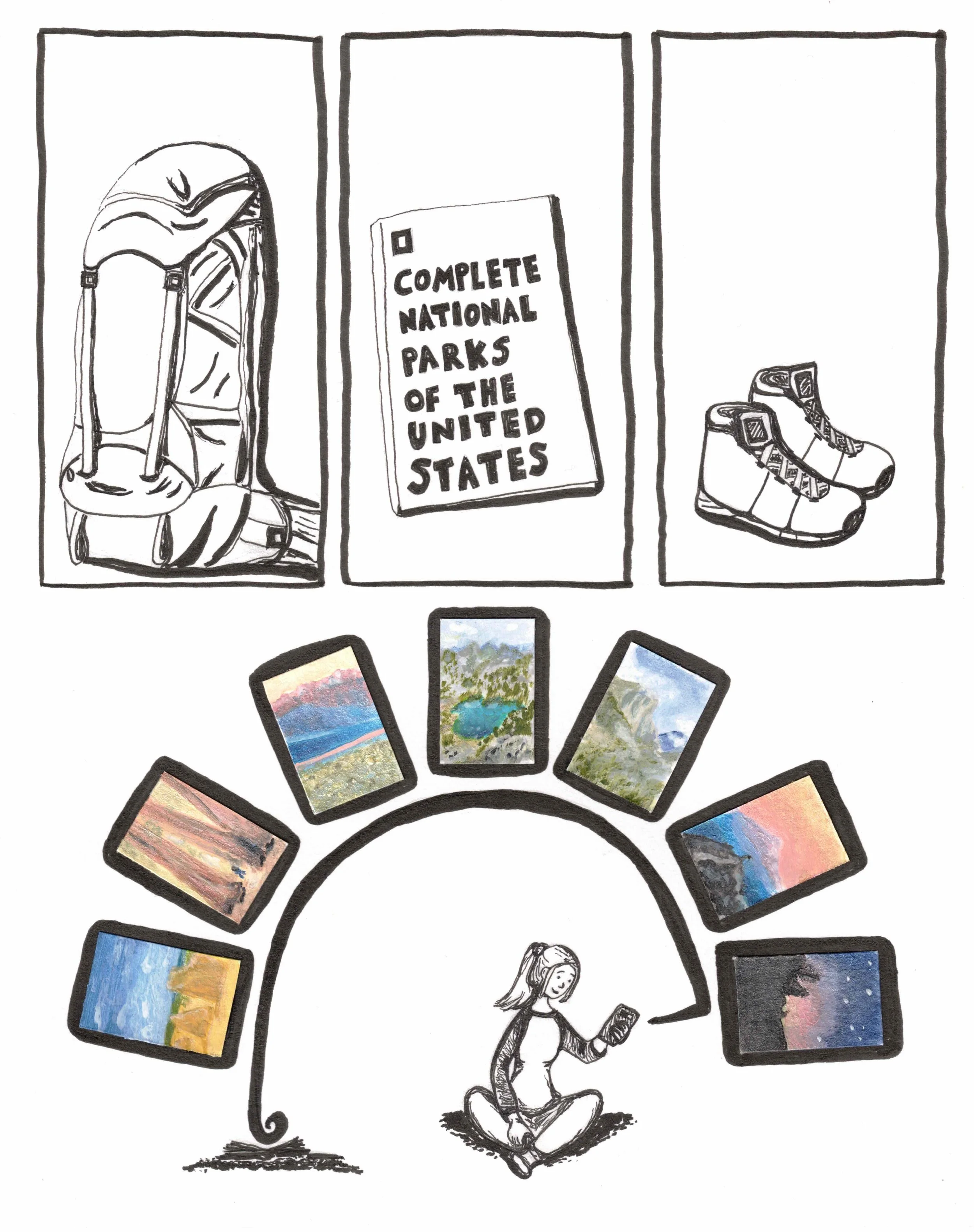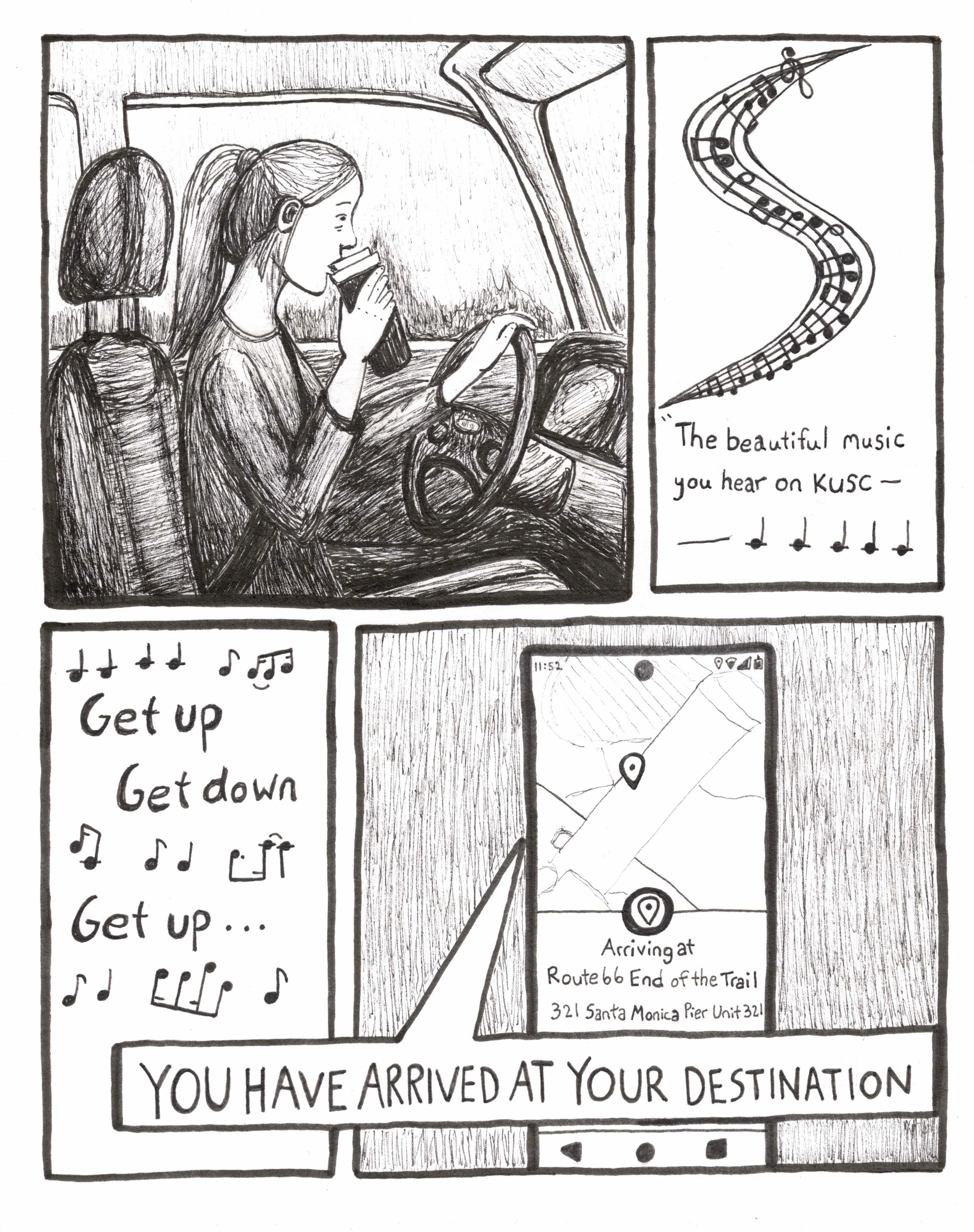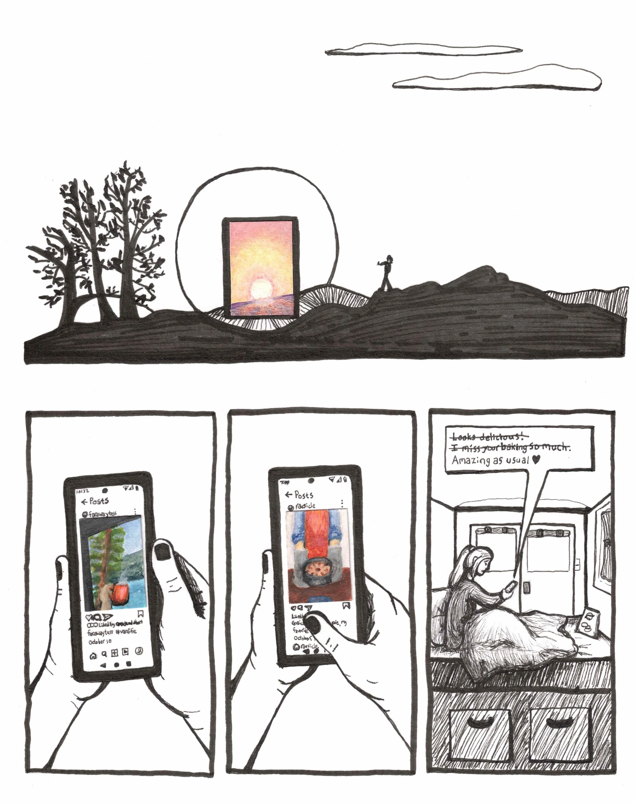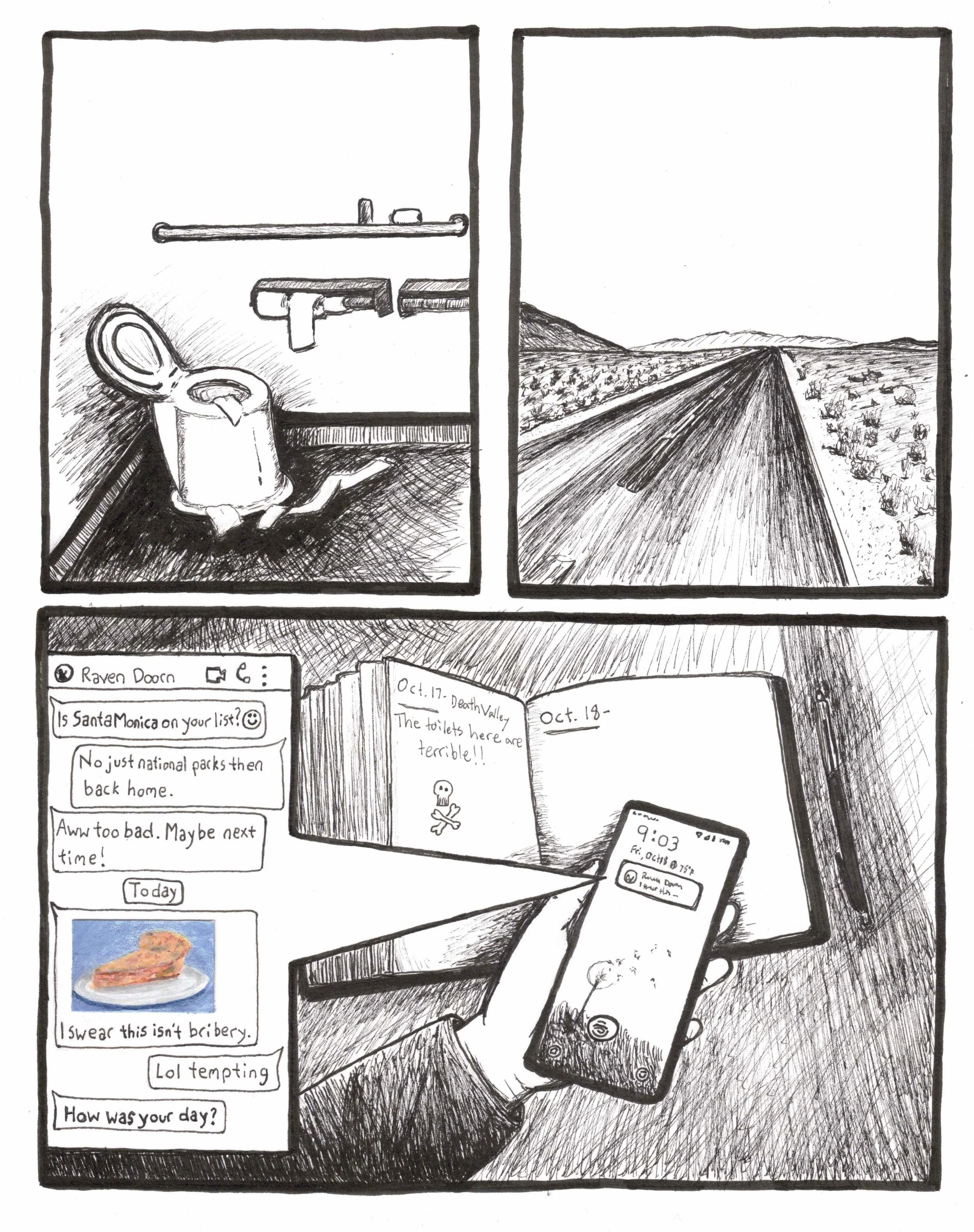 I created this comic for Inktober 2024, combining tiny acrylic paintings with ink art. Each frame was inspired by a prompt, and since the prompts revolved around adventure, it ended up being a travelogue set in California with a romantic subplot.